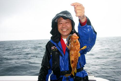 最近、活躍が目立つ岡崎忠夫さん、良型ガシラ(カサゴ)に笑顔
