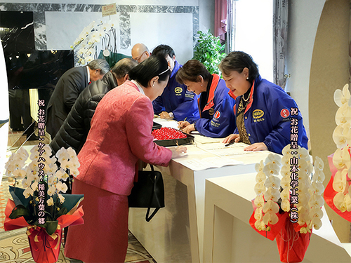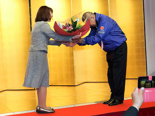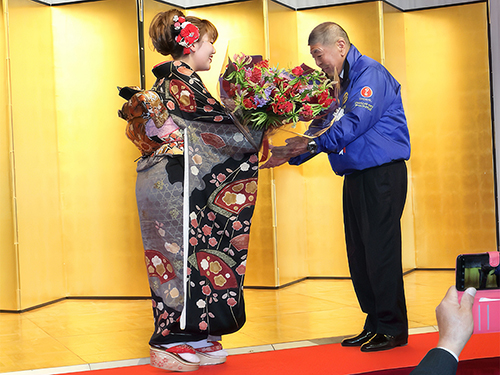 ![]() 山陽釣り具代表取締役社長、清水美智子様より花束ご贈呈いただきました |