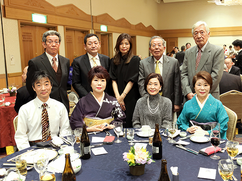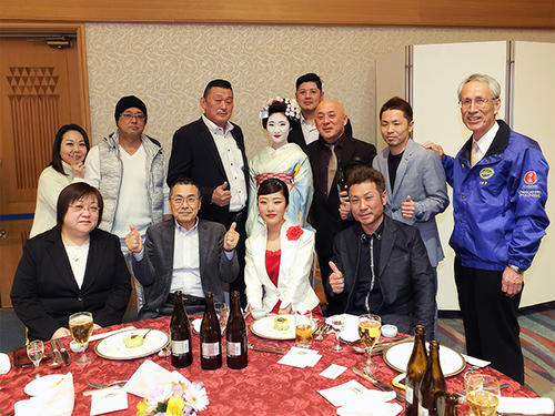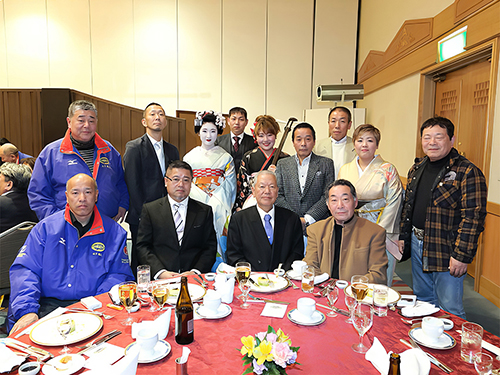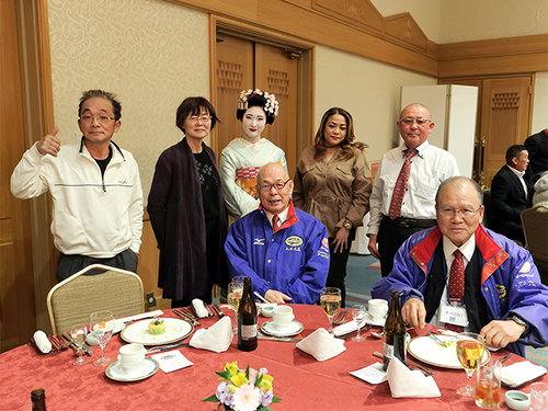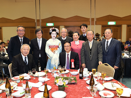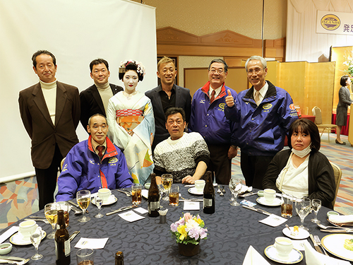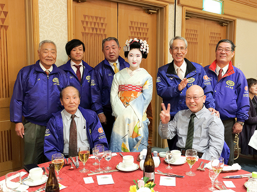 ![]() 終盤に舞妓はんを囲んで記念撮影 |