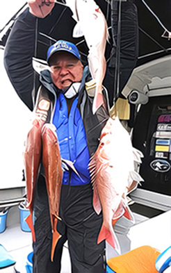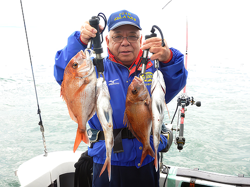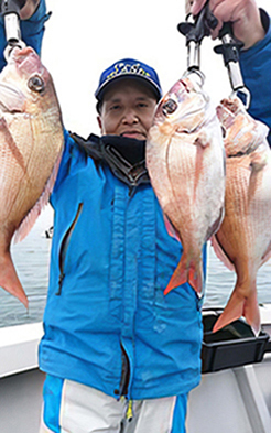 自信所有のマイボートで釣り慣れている 川田幸正さん、いきなり4連で上げる