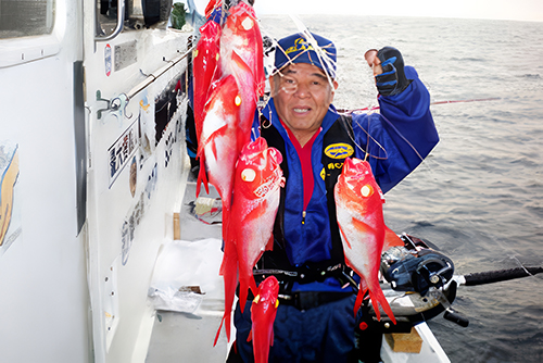 今回の釣行は一人平均30匹、全員で釣り上げたキンメダイは、合計150匹の好釣果に恵まれストレス解消になった。